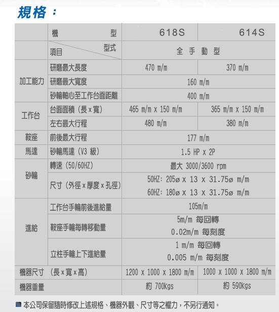 臺灣宇青品牌磨床機(jī)械特性:LSG-614S/LSG-618S